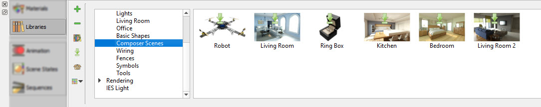 The library panel, on the other hand, will change to show the Basic Shapes, Composer Scenes. This library provides users with quick access to frequently