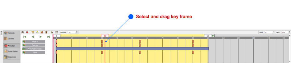 The user can also change the location of any key frame on the time line, by selecting then dragging it from a location to another.