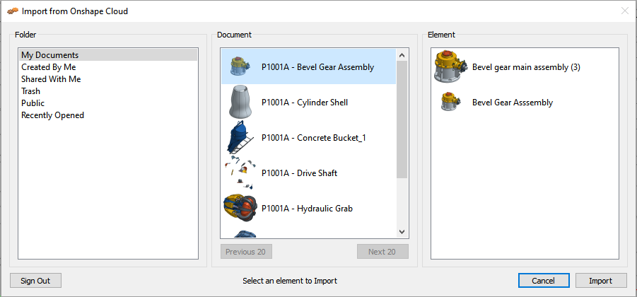 Once you select a folder from the list, the contents of this folder will be displayed in the documents list. Then select a document to display all the elements included in that document. After that select an element and Click import to access the selected design from the OnShape cloud server through SimLab Composer.