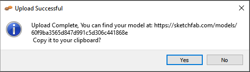 Once the uploading is completed you will get a message with a link to the uploaded model, the message will also ask you whether you need to copy this link to the clipboard in order to be able to use it by pasting in a web browser. (as you see in the image below).