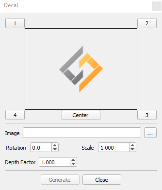 Applying a company Logo, or product images to 3D models is made easier with create Decal. Clicking this function will open the Decal window. The parameters in this window are;