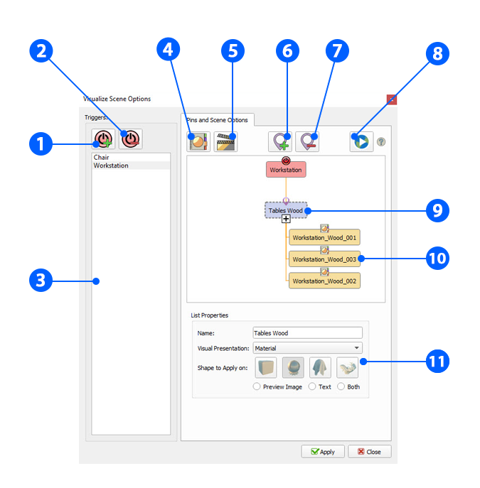 1. A Trigger displays Pins if interacted by the user in SimLab VR Viewer. To add a Trigger select a Scene Node from Tree or from the 3D Area.