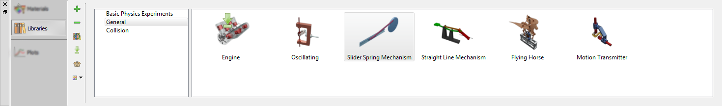 The Models Library acts as a container for pre-installed simulation models that come with the Simulation Edition of SimLab Composer, distributed into three groups: Basic Physics Experiments, General, and Collision (as shown in the following image). It is located at the bottom for the Solids workspace. You can choose any model of the provided sample just to run it as it is or edit it as you wish.