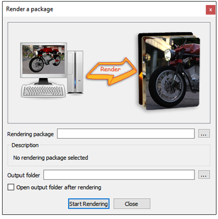 Copy each file to a rendering machine that has SimLab Composer already installed. Click the Render function, in the Package group, to open its dialog. Browse to the rendering package (*.srd) file, and select the output folder. Check the Open output folder option, and then click Start Rendering. A rendering animation progress bar will continue to appear along with rendering menus until the animation rendering is done.