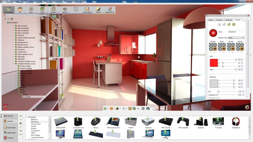 Scene Building workbench is equipped with all the tools needed to build 3D scenes. Upon selecting this workbench the workbench task bar will show the following tasks as shown in the picture below, File Menu, Move Menu, Create Menu, Geometry Menu, Material Menu, UV, Scene States Menu, Render Menu, Image Effect Menu, Navigator Panel: