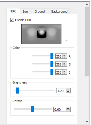 The color and brightness of the HDR image can be adjusted in the render settings dialog, and the new settings will automatically be saved and applied. The user can also rotate the environment image, by adjusting its slider in the render settings dialog.