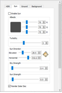 3D scenes require some sort of lighting, to give 3D scenes/models a more realistic look. Environments for rendering in SimLab RT can get lighting from HDR, from Sun, or from lights and emitters defined in the scene. The user has the option mix and match between these light sources. This can be done by enabling the HDR and the Sun each from its Render Settings dialog; this dialog has four tabs, described below;