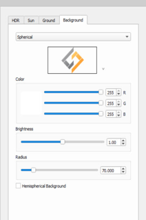 Spherical Background: enables the user to select (*.hdr), (*.exr), or any image file, that will be wrapped around a sphere or hemisphere, and select color, size and brightness. This option is added to give users more control since the Environment-HDR (global HDR) in the Render Settings dialog can be rotated, but cannot be scaled.