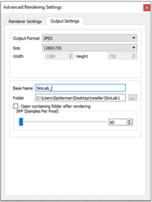 The properties panel will display Render Settings dialog. In this dialog the user can input the base file name, the output folder, and SPP to limit the rendering. The open containing folder check option will open the output folder after finishing rendering.