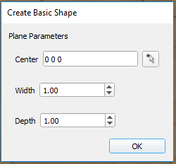 • Plane: a button that allows users to create a Plane by entering Center coordinates, Width, Depth, and Height of the box parameters in its dialog box which appears if clicked. The below Figure shows the Create Basic Shape dialog box for Plane.
