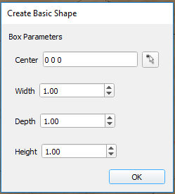 • Box: a button that allows users to create a box by entering Center coordinates, Width, Depth, and Height of the box parameters in its dialog box which appears if clicked. The below Figure shows the Create Basic Shape dialog box for Box.
