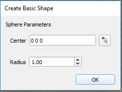 • Sphere: a button that allows users to create a sphere by entering Center coordinates and Radius of the sphere parameters in its dialog box which appears if clicked. As shown in the following image, the Create Basic Shape dialog box for Sphere.