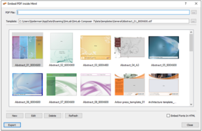 3D PDF template files can be embedded into WebGL/HTML. Clicking this function button will open the Embed PDF inside Html dialog. In this dialog the user can choose the PDF file to embed, or create a new file. The Embed Fonts In HTML check box will include the template fonts in the exported PDF file. After setting all parameters, clicking Export will open the Export dialog. The user can input the file name, and choose its location, and then click Save.