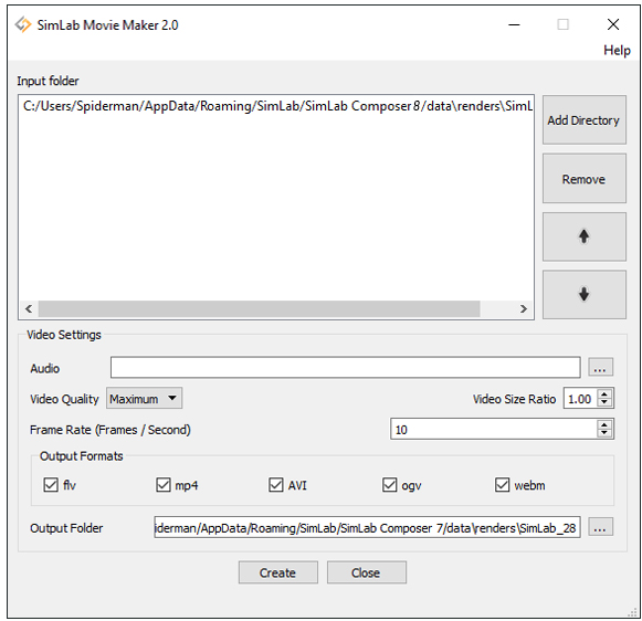 If the Generate Video option is not checked clicking the Create button will generate images, for all the selected key frames, in the render output folder. When the Generate Video option is checked, video will be created using another application for creating videos.