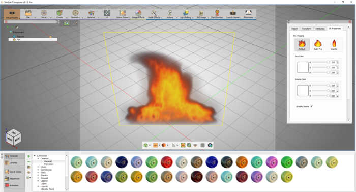 When setting the fire source for VR, the user has options for choosing the fire presets and choose (fire/smoke) color.