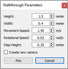 • Start: The button allows you to open the Walk-through Parameters dialog box. This group of parameters controls dimensions and behavior of the camera measured in meter, m/s,or rad/s, which you can set to define and describe the characteristics of the camera object that you will take on while being in the scene.
