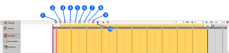 Time Line provides the user with a tool to visualize and edit animation key frames. The time line is displayed by default in the Library panel of the Animation workbench. Click the Show/Hide details button in the top right part of the time line, to show or hide the timeline details.