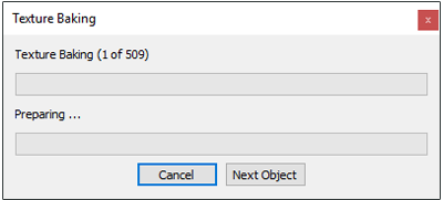 After confirming the baking settings by pressing OK, a progress box (as shown in the following image.) appears to reflect baking progress for each object being baked in addition to the overall progress. Clicking the Next Object button will skip baking progress for the current object.