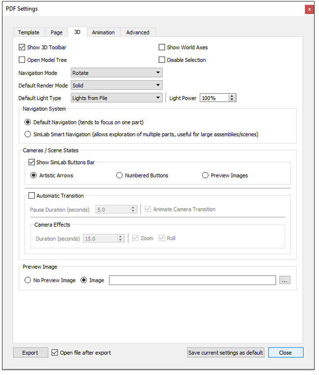 Navigation System: in this group the user can set the navigation mode, in the exported 3D PDF file. The navigation mode can be either Default Navigation; which tends to focus on one object in the scene, or SimLab Smart Navigation which is suitable for large scenes.