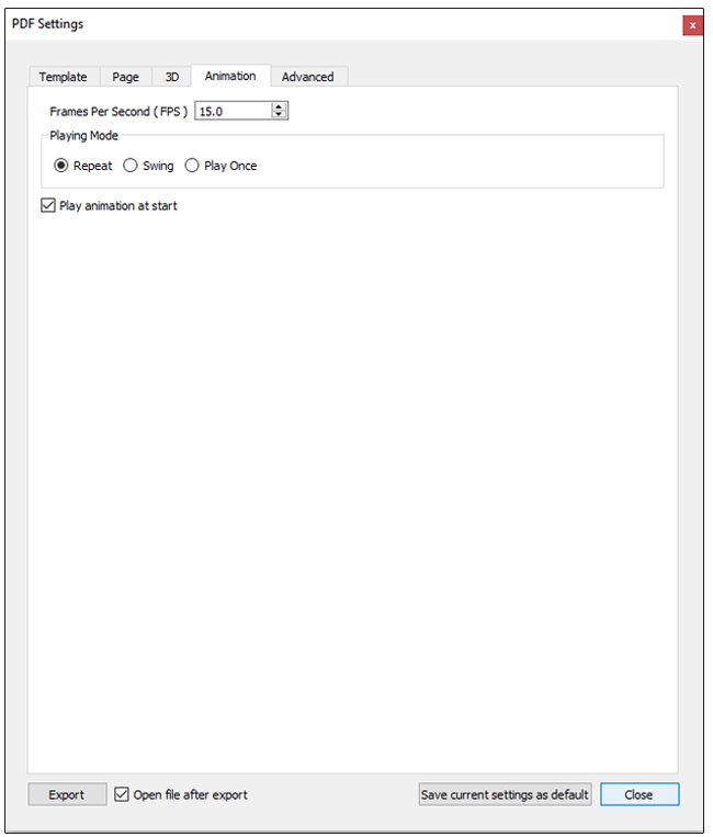 Navigation Mode: The user can set the default navigation mode for the exported 3D PDF file to be Rotate, Spin or Walk. The user of the 3D PDF file can choose to change this default mode from inside the exported 3D PDF file.