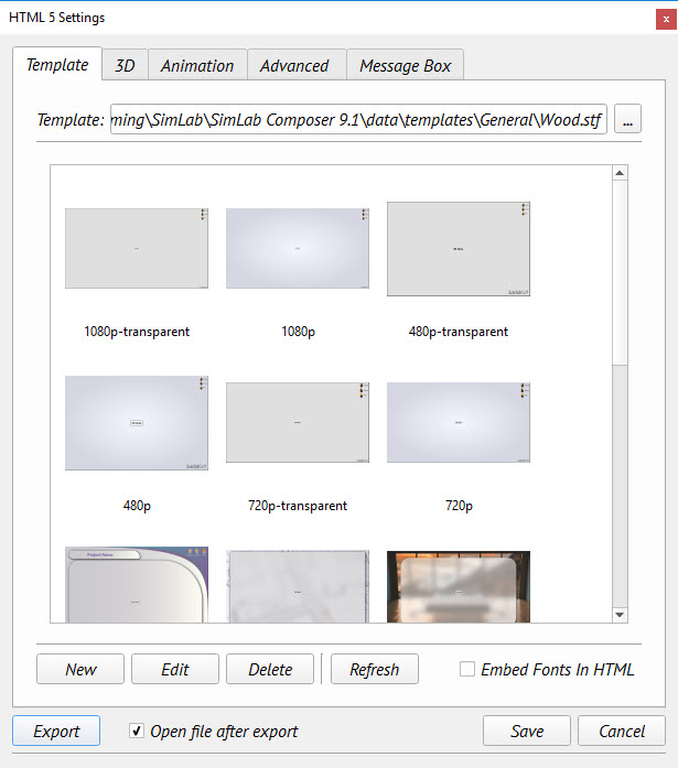 Template tab is where the user can browse the folder containing the HTML template(s) to use, and create New templates, Edit, Delete, or Refresh template(s).