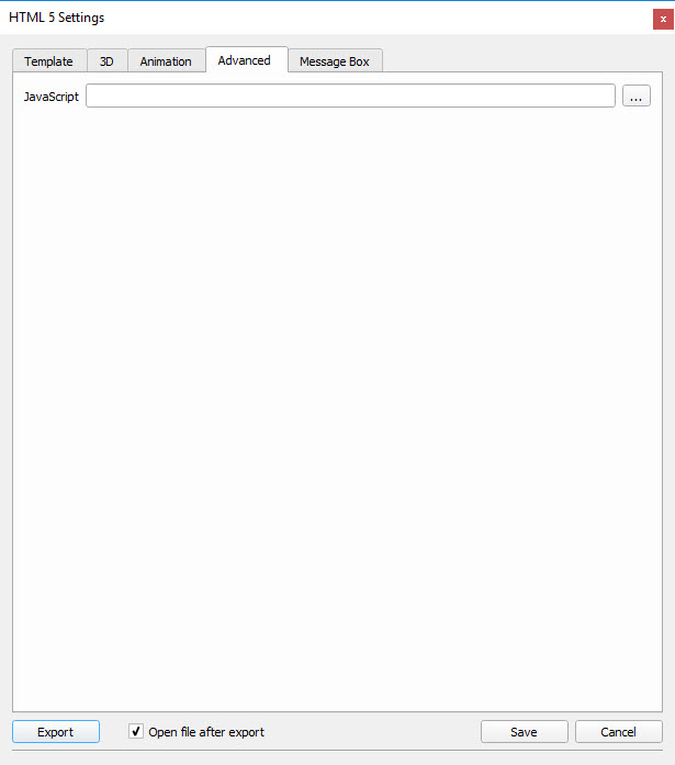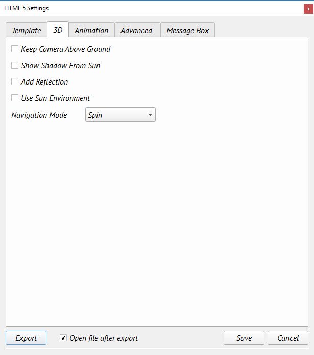 HTML5 Settings dialog enables the user to control the generated HTML file(s). Before exporting to HTML, the user needs to select a template to use for export, and to set other HTML parameters.