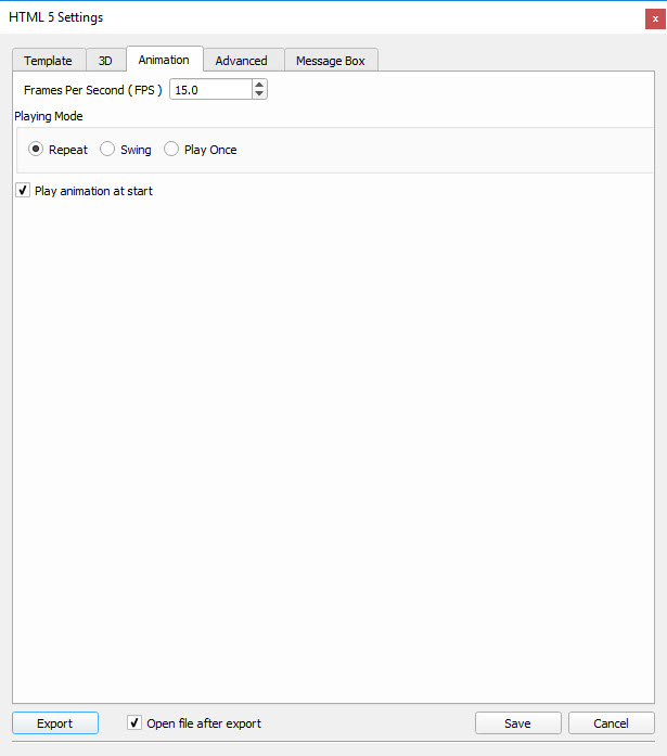 Frames per Second (FPS): is the number of frames played per second for all animations created in the exported 3D SimLab scene. This controls the speed of playing all the animations in the scene, a value of 5 will result in a slower motion animation than a value of 15.
