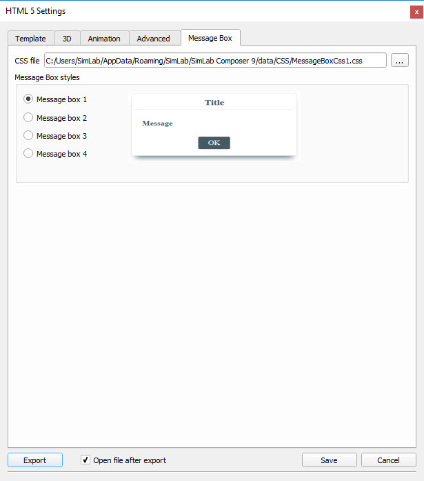 In the message box tab, user can select the style of message box which display in HTML file.