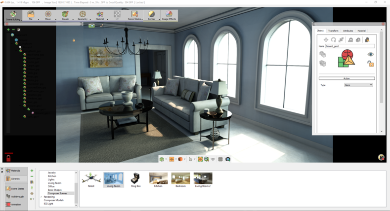 This function starts real time rendering in clay mode. Which is a real time rendering mode used for viewing the effect of lights in scenes, by changing all materials, except glass and emitter materials, to gray matt.