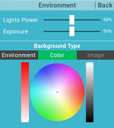 Advanced Settings: user can edit the the power of Lights such as Spot and IES lights which her\him create it before into the scene, also can chose the background to Environment (HDR, Sun Light), single color or the image.