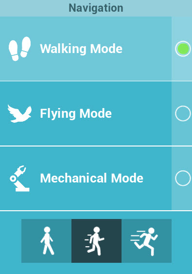 5. Navigation Modes: there are a three navigation mode into the VR Viewer: walking, flying and mechanical.