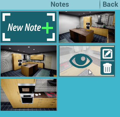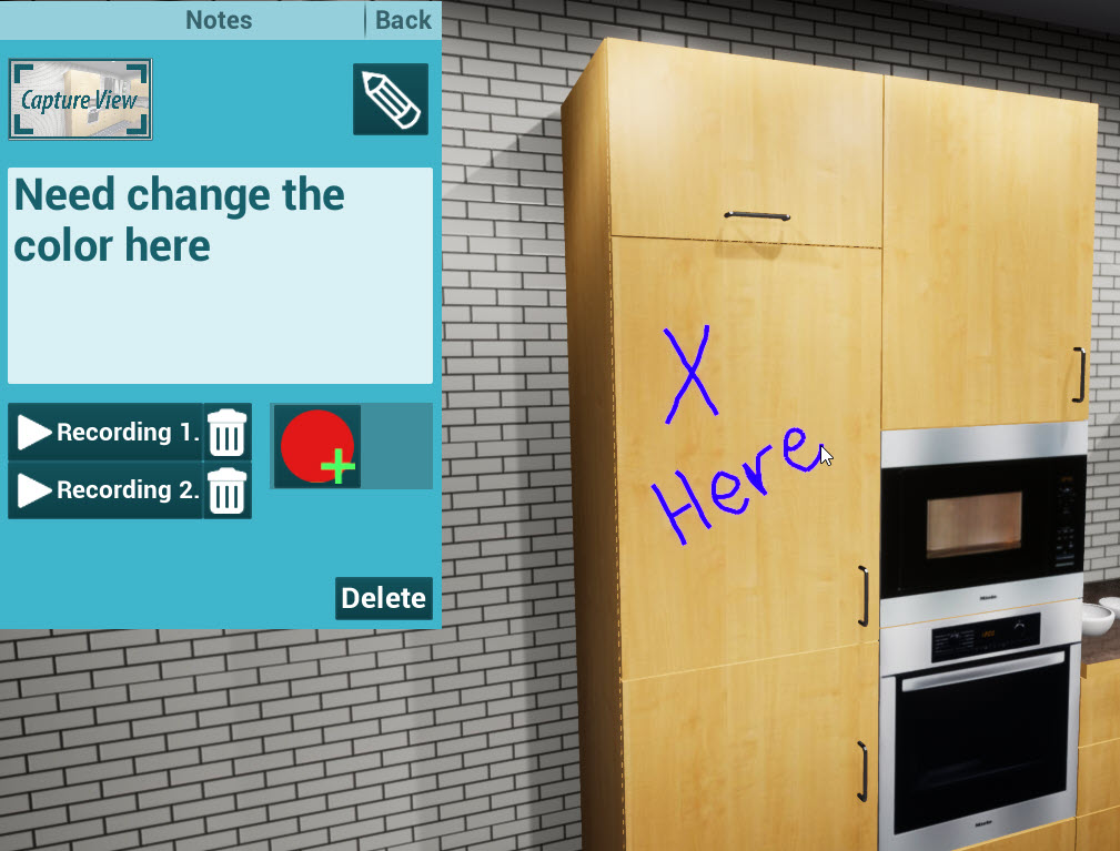6. Create Notes: with new feature user can be create a notes into the VR Viewer, These notes allow her\him to save the viewer location with the direction seen and reference it at any time, also can include some notes using the keyboard or by sketching on the objects and recording the voice.
