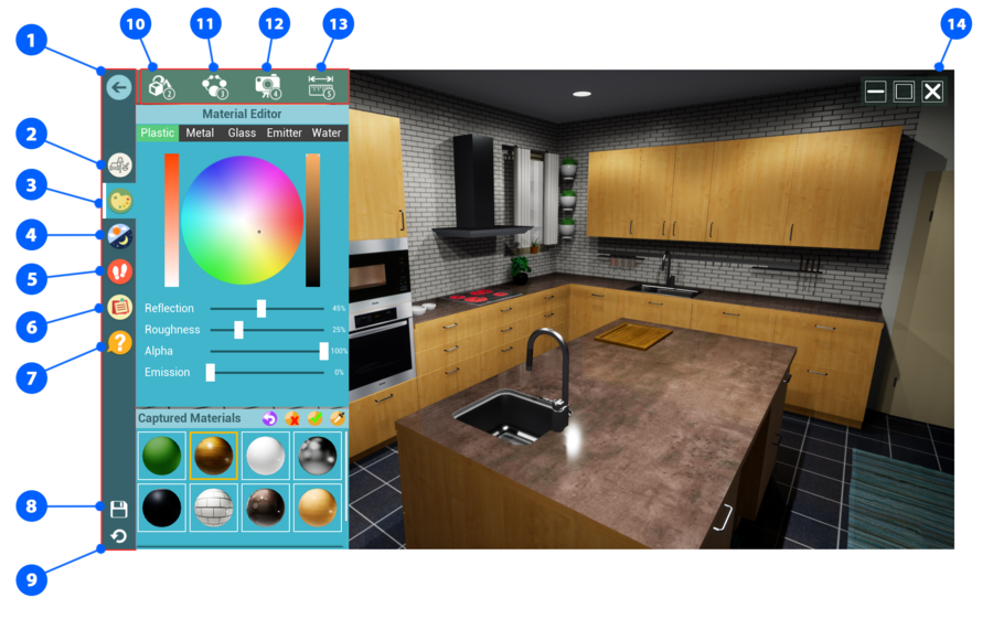 3. Material Editor: In this menu as shown above, user can select any material from the object in the VR Viewer and change its color, material type (Plastic, Metal, glass, Emitter and water), with the useful basic settings into the VR Viewer. also her\him can save the material in the small library under the "Captured Materials" from the viewer by select the Eyedropper icon and press on the object, her\him can apply the selected material from this library on the objects by select the green mark icon then press on the object and delete it by press the red x icon.