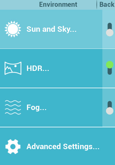 4. Environment Editor: the environment editor allow user to make some adjustments to the environment for the scene, in the image below there are a four options included in this menu: Sun And Sky, HDR, Fog and Advanced Settings.