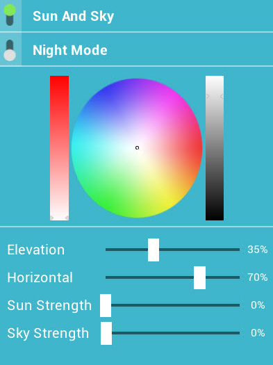 Sun And Sky: in this option user can enable/desable the sun and sky environment, and display between the day and the night mode, also can edit the sun and sky settings values and the sun color into the VR Viewer.