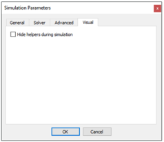 The Simulation Parameter dialog box appears when the Parameters button is clicked. This dialog box is a preference pane contains multiple panels, using tabs as a navigational widget for switching among three sets of settings. The three tabs are: General, Solver, and Advanced.