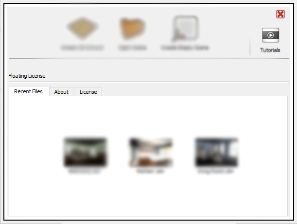 Upon starting SimLab Composer, or clicking on new button, the new scene dialog will appear. In this dialog the user can select to create a 2D ground scene, open a scene, or create an empty one. Images for the last opened scenes are displayed in this dialog for quick access. This last files list is also accessible from the arrow beside the open scene icon.