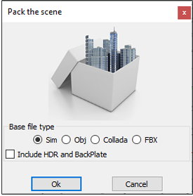 The packed *.zip file will include all 3D models in the scene, along with their materials and textures. HDR files and BackPlates can also be included, if the user checks this option. Packing a scene is necessary for the user to share 3D scenes created in SimLab Composer with others.