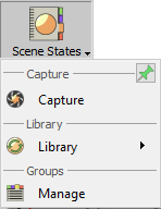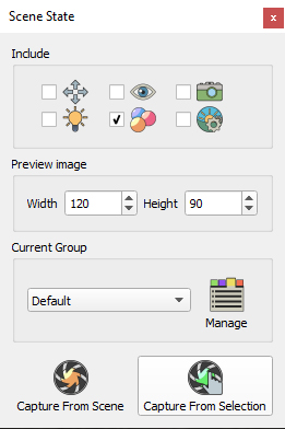 With the properties checked, the user needs to click the Capture option, to be either From Scene or From Selection. The first option will capture a scene state for the whole scene with the properties checked in the Default Apply group. The From Selection capture option captures a scene state for the selected model(s), with the checked properties. Depending on the checked properties, the generated scene state will be added to the corresponding tab(s) in the Scene States library.