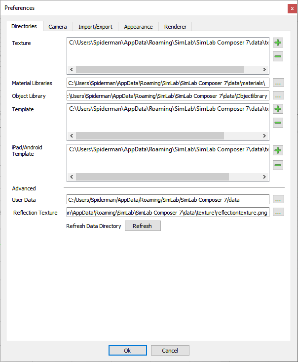 In this tab the user can change the default directory(s) for Textures, Material libraries, Object libraries, and Templates used for exporting to 3D PDF, HTML/Web GL, and iPad/Android.