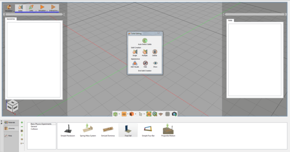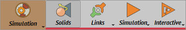 The Simulation Tool composed of four menus, use these menus to navigate and switch among the sets of widgets. Solids are defined in the Solids menu. In the Links menu, solids properties and relationships between each other are set Finally, the simulation is controlled and performed in the Simulation and interactive menu: