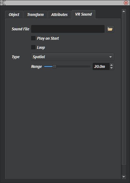 This function adds 3D Sound object to the scene, and its Object Tree. Selecting the 3D Sound form the tree will display its properties in the Properties Panel, VR Sound tab. The 3D sound object occupies a location in the 3D scene.