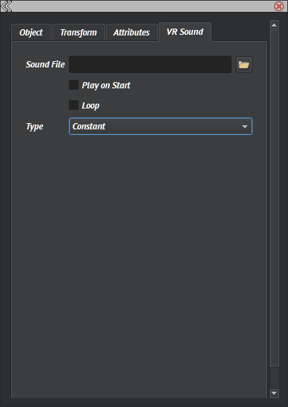 The user can select the sound file to use, in this tab. The way the sound will be played can be set to play once, by selecting Play on Start, or to continue playing in a Loop.