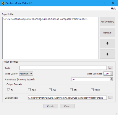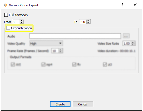 If the Generate Video option is not checked clicking the Create button will generate images, for all the selected key frames, in the render output folder. When the Generate Video option is checked, video will be created using another application for creating videos.