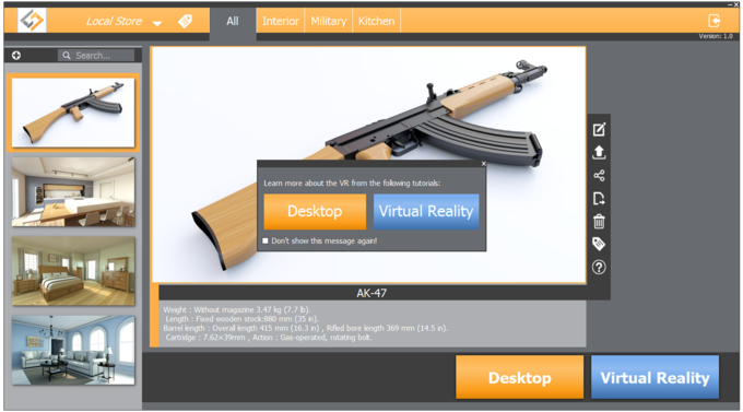 Using SimLab VR Viewer allows user to see the list of available 3d models on the left side of the framework, after selecting the models the user can starting desktop viewer or VR mode.