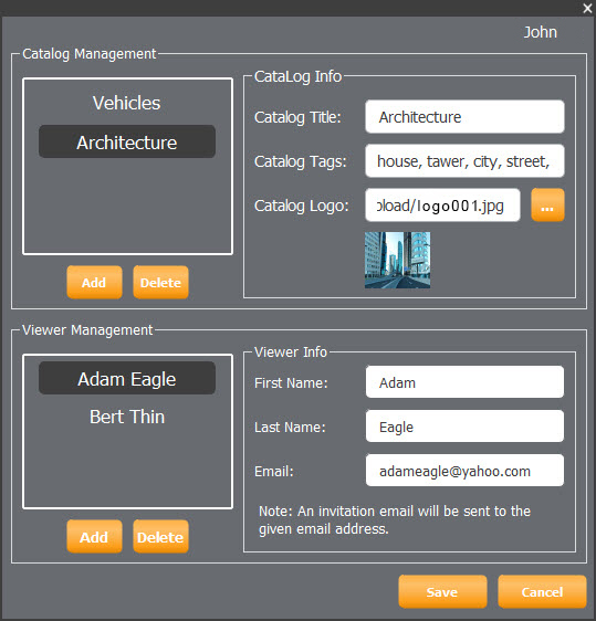 5. In the Viewer Info field, You can add more than one user who can view the packages within this catalog, to add viewer press Add and enter the first name, last name and email for viewer, when you finish press Save.
