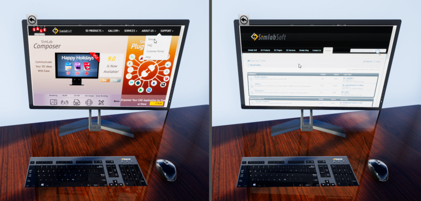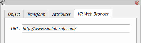 When the user selects this option, a new object like a plane named "VR Web Browser" will appear in the 3D area, and added to the objects tree. Select it and go to Properties dialog, under the VR Web Browser tab, to add web link into the URL field as shown in the image below. The user can change the width and height of the Web browser plane using the white point on it.